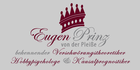 "Eugen Prinz v.d. Pleiße", ist ein weiteres artfolio-Projekt, welches schon einige Jahre auf meiner künstlerischen Agenda steht. Die Kunstfigur "Eugen Prinz ...", gleichsam der Protagonist des Projektes, bekennt sich als Kausalprognostiker, Hobbypsychologe und vor allem als bekennender Verschwörungstheoretiker.